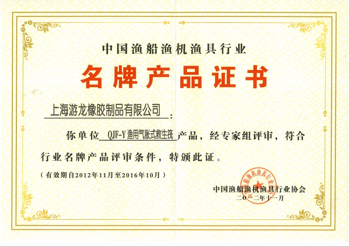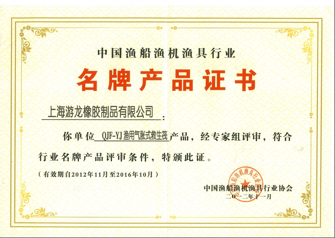 会上,我公司生产的救生筏QJF-Y型、QJF-YJ型和KHA型渔用救生筏荣获渔船渔机渔具行业名牌产品称号。