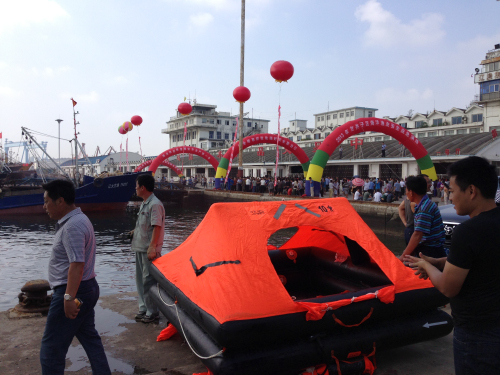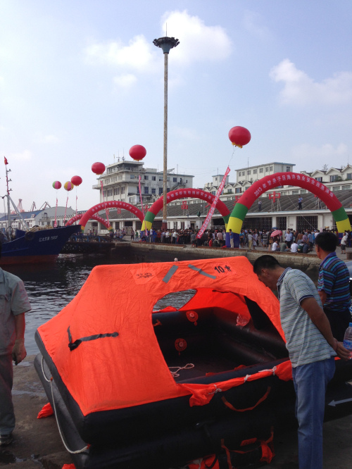8月29日,大连市甘井子区农林水利和海洋渔业局在辽渔集团码头举行了“2013年度海上应急救援演练”,700多名船东、船长及渔民参加了此次应急救援演练活动。 此次演练活动中船用救生筏使用演练的产品系我司渔用筏产品。 现场活动瞬间